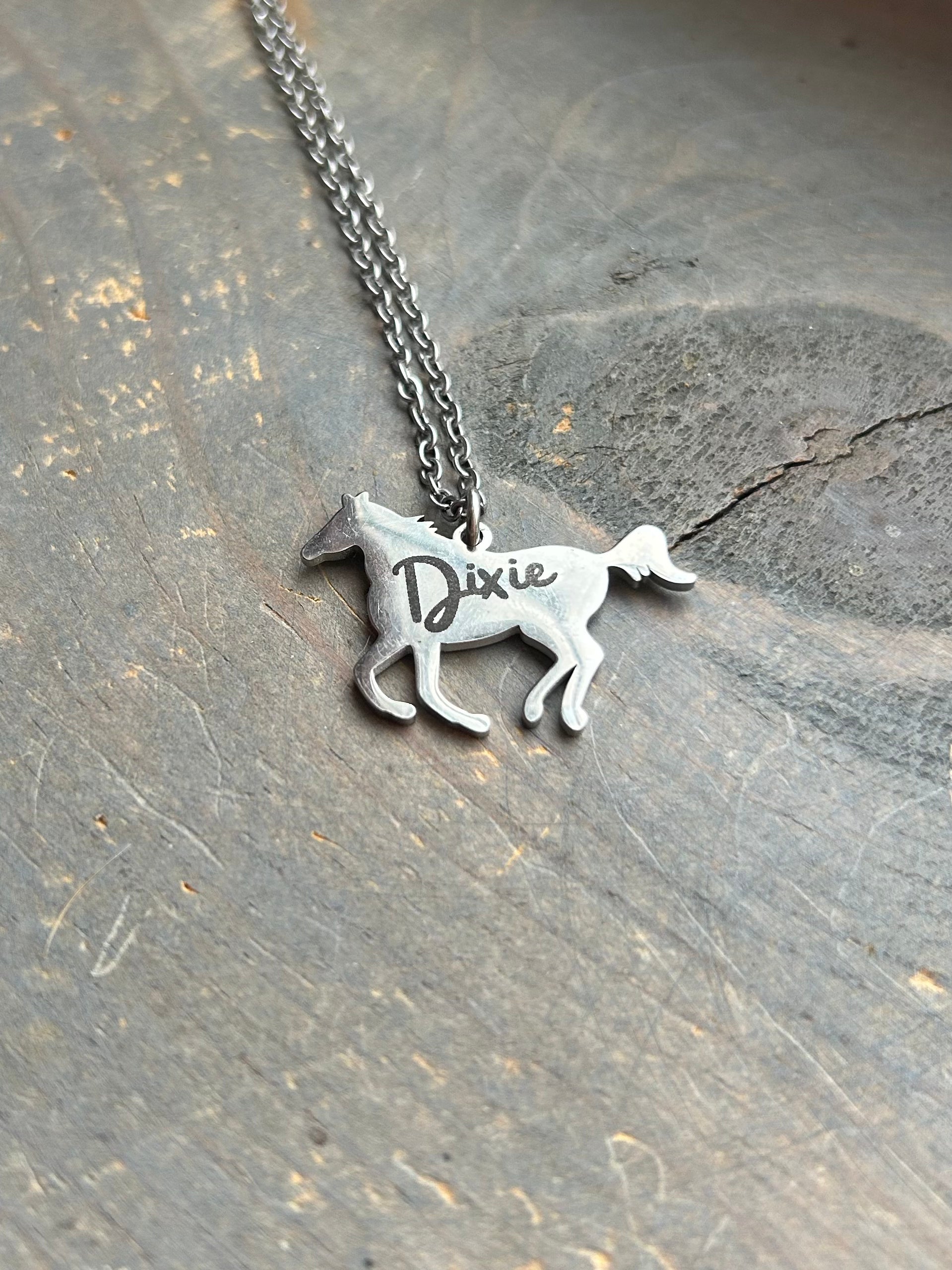 Celebrate your love for horses with this elegant Custom Engraved Horse Necklace. Choose from silver or gold tones, and personalize it with a name, date, or short message for a unique and meaningful accessory.